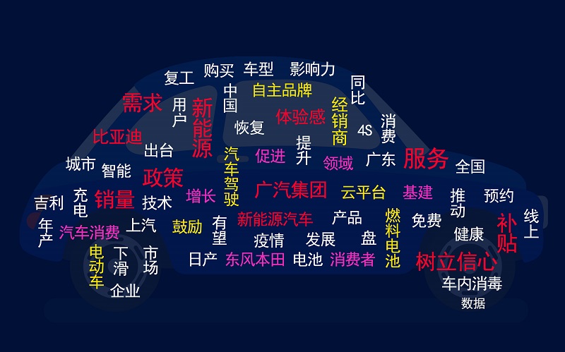 在新华睿思·数媒智慧分析平台中,我们找到了关于疫情下汽车销售的关键热词,新能源、政策、补贴成为第一关注热点,电动车、销量成为第二关注热点。