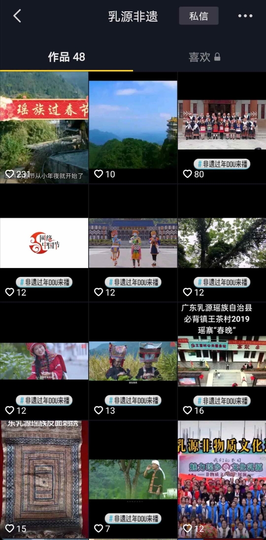 春节前后,乳源县非遗中心工作人员在休假中工作,在工作中休假,深入民间,扎根乡土,通过抓拍和走访,生动记录了小年夜、年初一至初五的瑶族春节民俗,制作了《乳源过山瑶的春节》《九歌组合》等多部微视频作品,并被学习强国平台采用。至元宵节止,共在学习强国、抖音、快手、微信公众号等平台推送作品20余部。这些充满瑶风瑶韵的微视频作品也得到了群众的喜爱和好评。