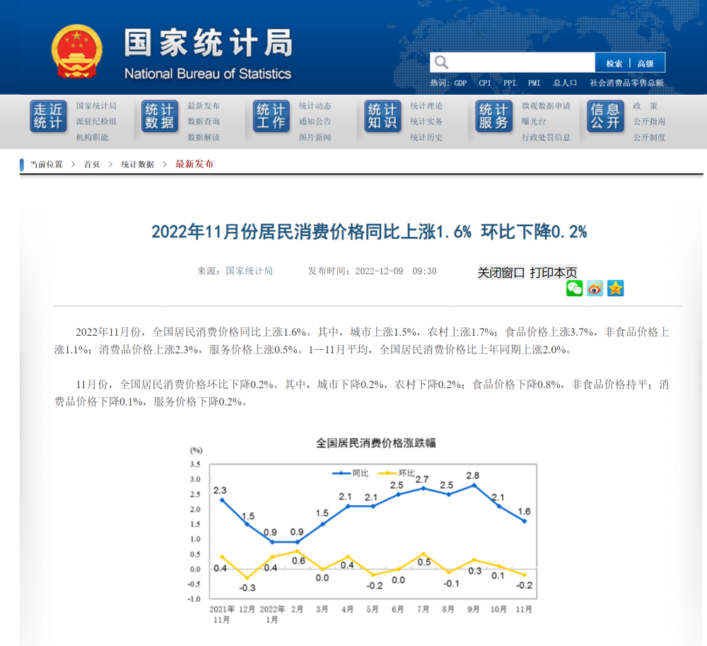 国家统计局:2022年11月份居民消费价格同比上涨1.6%