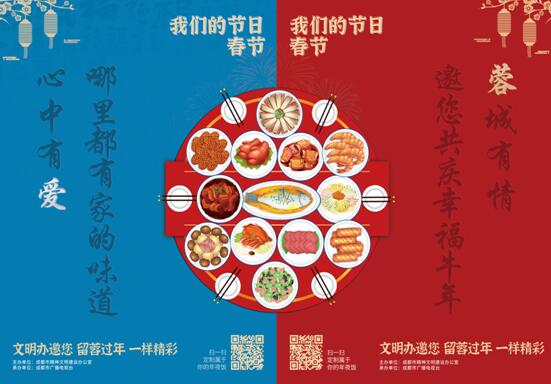 为积极响应“就地过年”号召,营造温馨春节氛围,由成都市精神文明建设办公室主办、成都市广播电视台承办的“我们的节日·春节”云上过年活动邀您组团参与、积极分享。活动将采取线上互动方式推出自主设计分享家庭海报、创意春联遥送“定制”祝福;趣味答题赢得中奖机会;飨用春节小知识、文明风尚等春节文化套餐,为市民朋友送上一份暖心新春“年货”。同时,我们还走访桂溪街道天华社区、黄田坝街道成航社区等多个社区,送去新春祝福。