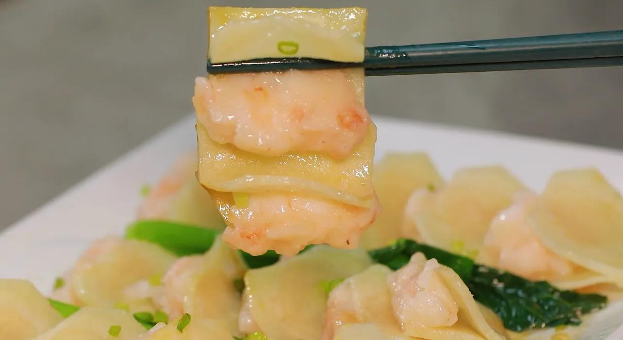 鲜虾仁酿竹山粉葛,汤塘特产的粉葛清甜软糯夹着鲜虾仁那紧实弹牙的口感,一口下去满是食材本身的纯粹鲜香。