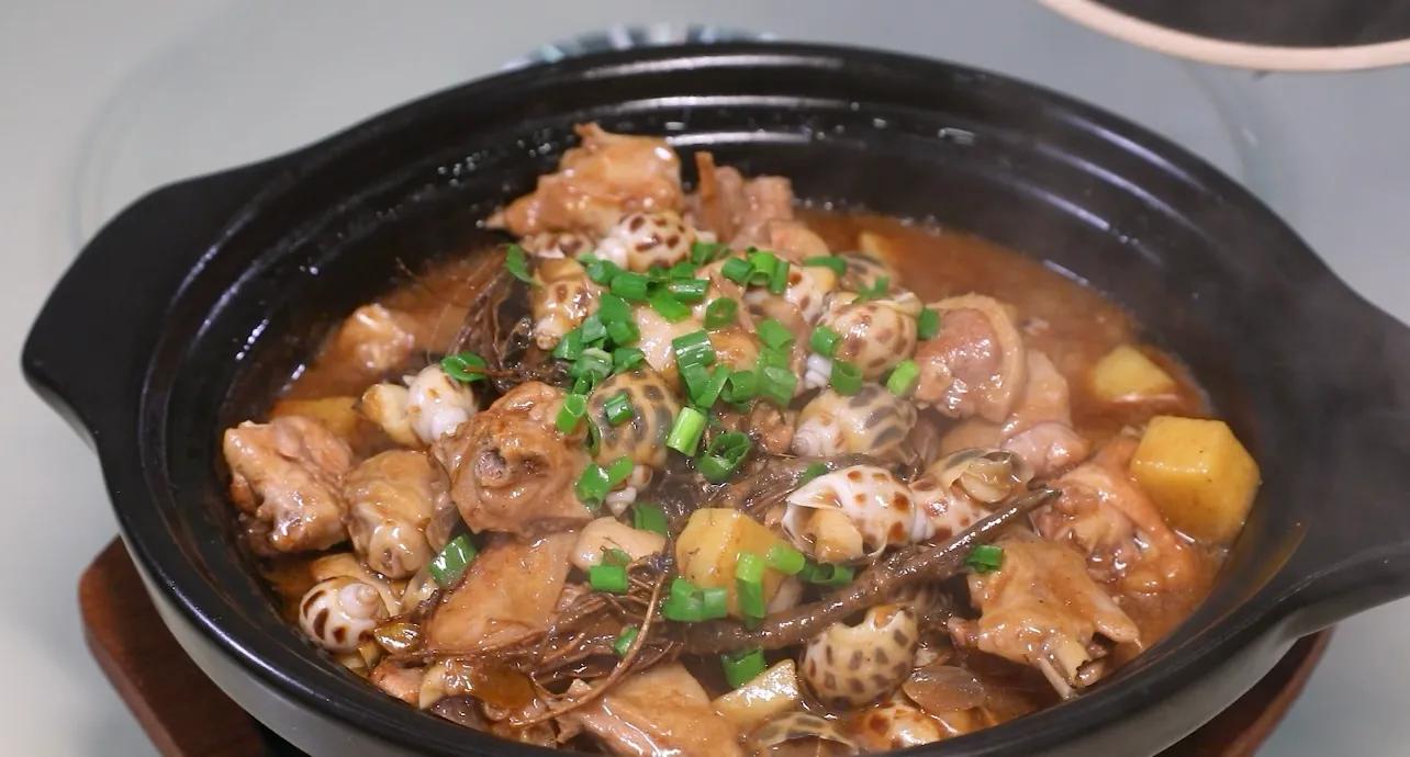 地胆头花螺焖鸭,老鸭与花螺慢火焖煮,地胆头特有甘香渗入每一丝肉质,温润滋补,暖入心脾。