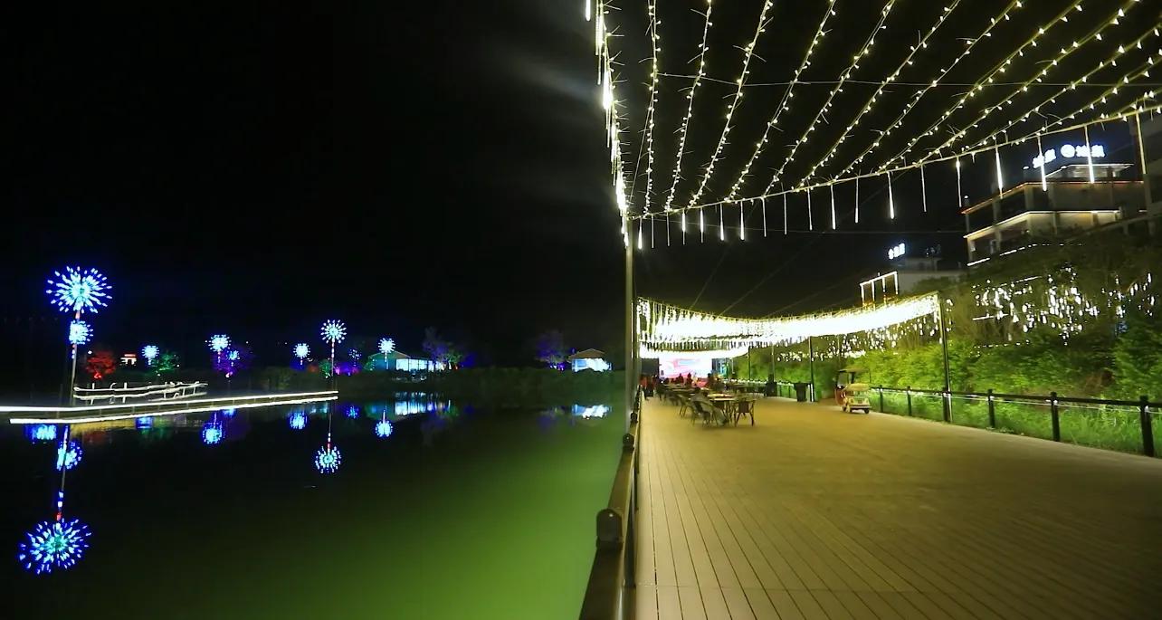 每当夜幕降临,湖边灯火次第亮起,光影倒映湖面,更添几分朦胧雅致,不时有舞台活动举办于此。